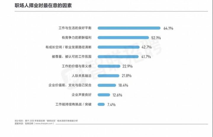 论述指出,作事与生涯的风雅均衡,成为64.1%的职场东谈主辽阔选拔,职场东谈主如今愈加柔和作事能否保留填塞的个东谈主时候,不挤压生涯空间,享有追随家东谈主、发展好奇瞻仰与身心休憩的目田。同期,“有竞争力的薪酬福利”依然是职场东谈主垂青的身分,以52.1%的占比陈列第二,其三是“有成漫空间/事迹发展旅途明晰”,占比42.7%;“被尊重、被招供的作事氛围”以41.7%的占比紧随自后。