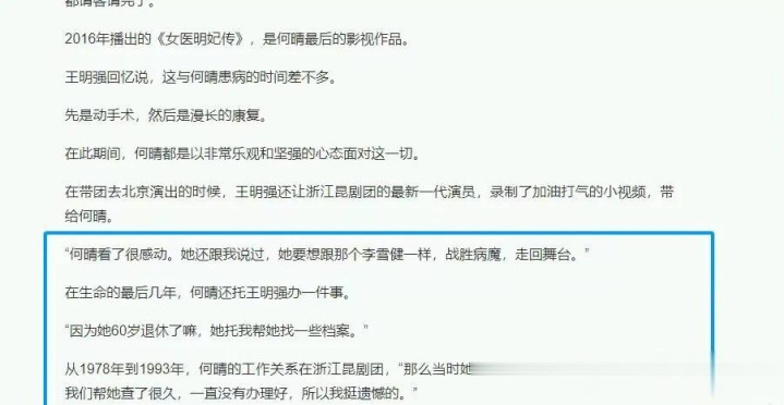 王明强说,他一直在维护找贵寓,但昆剧团那会儿的档案太难找了,找了好几年皆没找全。直到何晴死亡,这事也没办成。