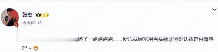 献技适度后,张杰通过微博幽默示意“牙尖被磕碎了极少点点点”。