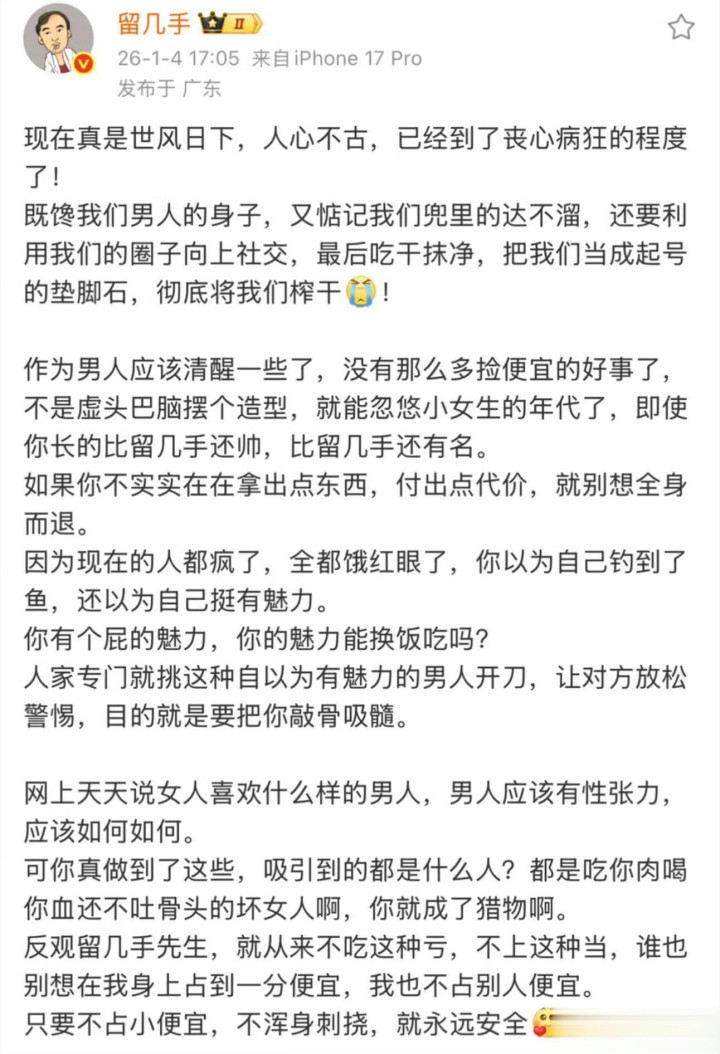 留几手在2026年1月4日的长文中,以童锦程事件为引,痛斥当下两性说合中的功利罗网,直指部分女性“敲骨吸髓”式的合计,并借机标榜本身“不占低廉”的处世形而上学,激勉网友对其“变相自负”和“蹭热门”的争议。